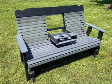 These gliders are made from weather resistant poly and fastened with stainless steel hardware to last a lifetime. This glider features a console that flips down to accommodate you drinks or flips up to make room for an extra person.